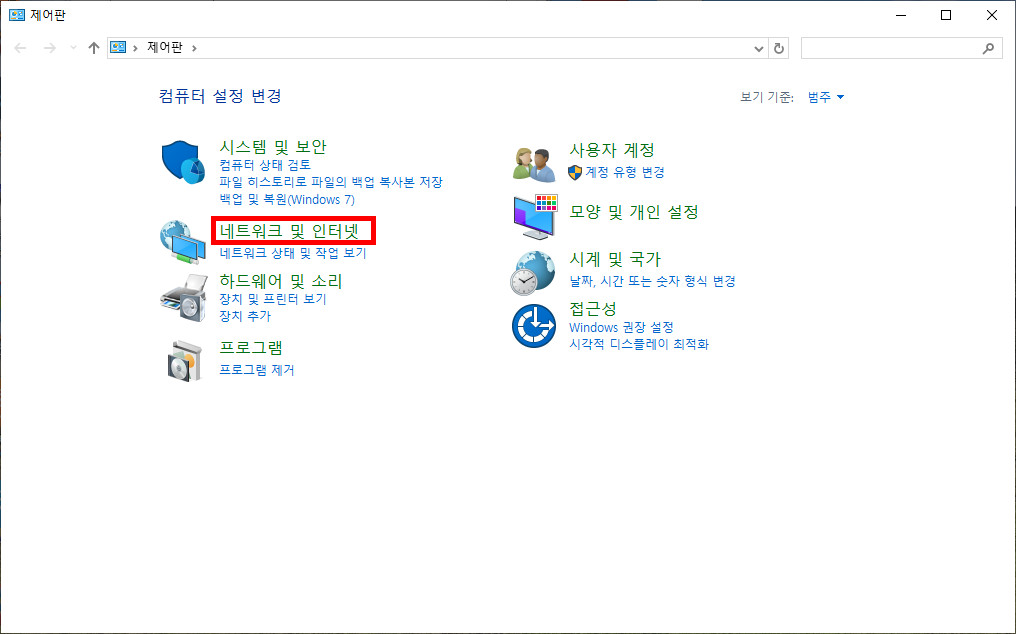 네트워크 및 인터넷을 클릭합니다.