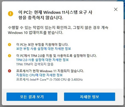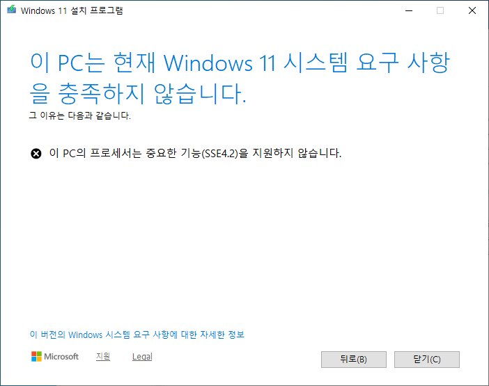 인텔 8세대 이전의 컴퓨터에서도 강제로 Windows 11로 업그레이드할 수는 있습니다만 SSE4.2 기능을 반드시 지원해야 합니다. 만일 내장 그래픽을 사용한다면 CPU 의 DirectX 12 지원도 필수입니다.