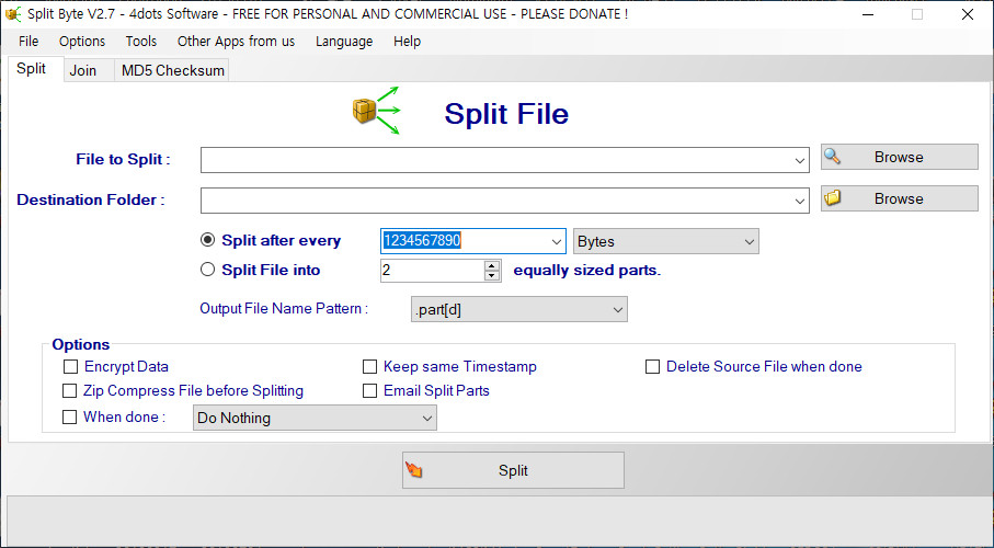 Split Byte 라는 프로그램은 바이트 단위로도 쪼갤 수 있게 해줍니다.