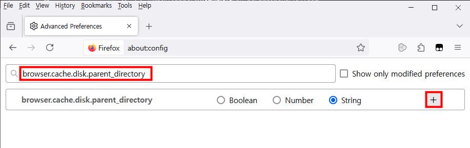 browser.cache.disk.parent_directory 를 입력하고 String 을 선택 후, + 버튼을 클릭합니다.