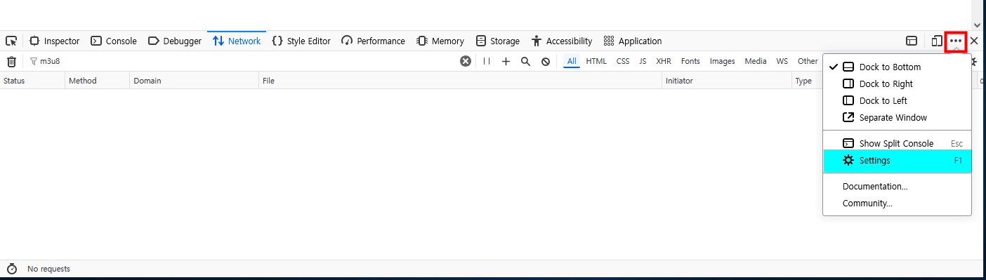 F12 키를 누른후, 오른쪽의 점 3개를 눌러 Setting 을 선택합니다.