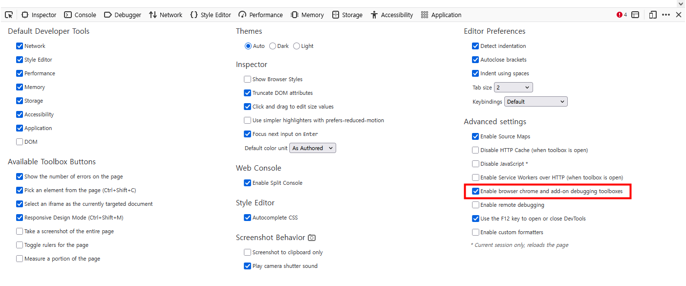 Enable broswer chrome and add-on debugging toolboxes 에 체크표시를 합니다.