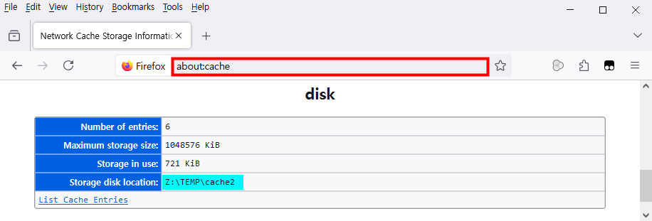 파이어폭스를 다시 실행시켜 주소창에 about:cache 를 입력 후, 제대로 바뀌었는지 확인합니다.