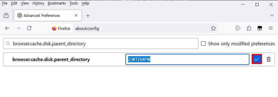 임시파일이 저장될 폴더명을 입력 후, 체크 표시를 클릭합니다. 그리고 모든 파이어폭스 창을 닫습니다.