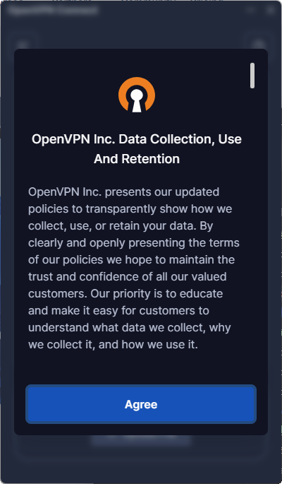 OpenVPN Inc. presents our updated policies to transparently show how we collect, use, or retain your data. By clearly and openly presenting the terms of our policies we hope to maintain the trust and confidence of all our valued customers. Our priority is to educate and make it easy for customers to understand what data we collect, why we collect it, and how we use it.