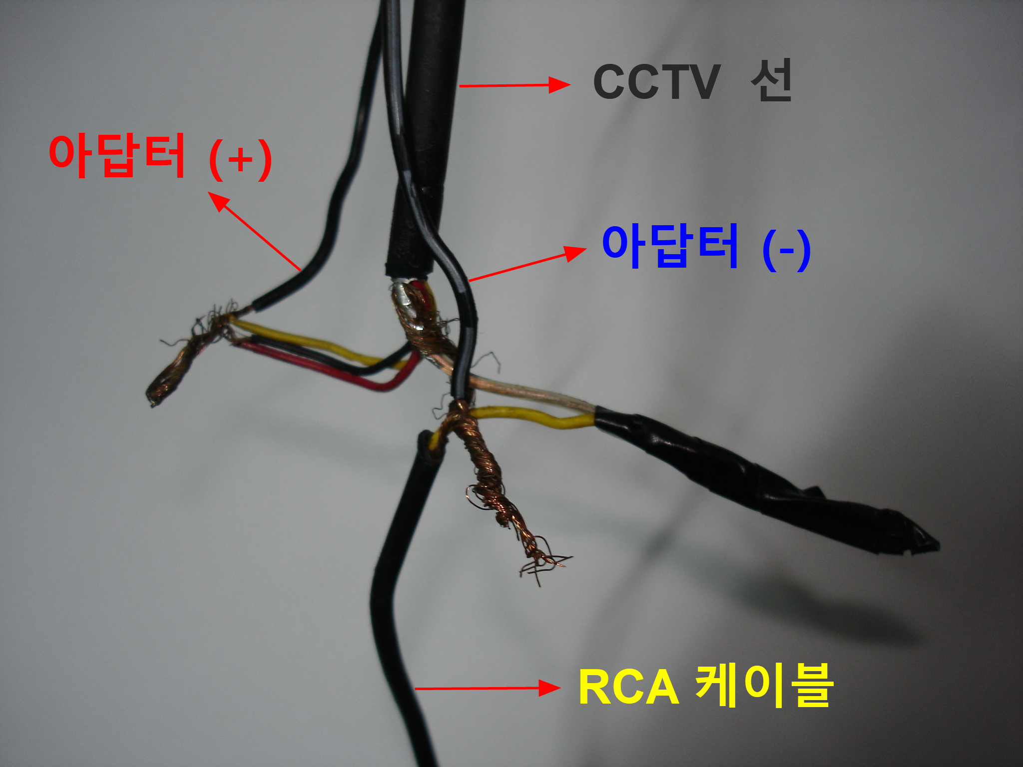 아래 표처럼 (-) 전원은 회색 부분을 전부 묶어주고, (+) 전원은 아답터와 카메라쪽 선만 연결시켜줍니다.