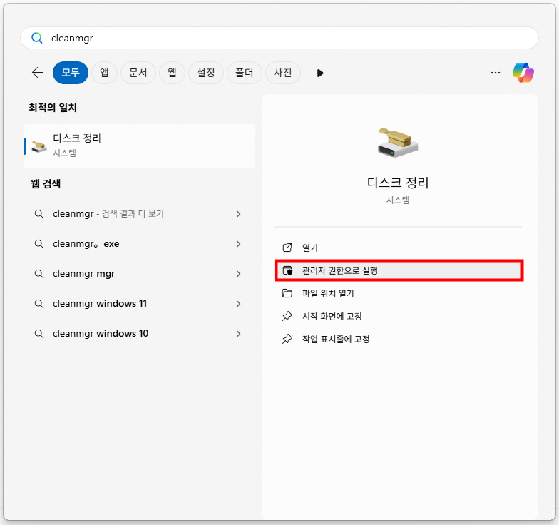 검색창에 cleanmgr 이라고 입력합니다. "디스크 정리"라고 입력해도 됩니다.