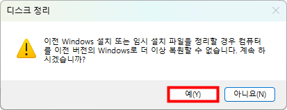 이전 Windows 설치를 정리하면 복원할 수 없다고 나오는데 예(Y)를 클릭합니다.