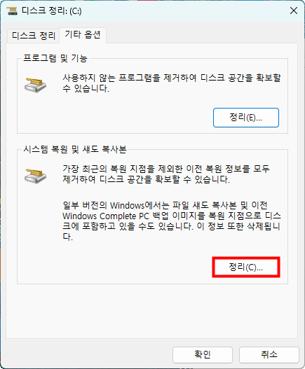 기타옵션에 보면 시스템 복원 및 섀도 복사본도 정리해주면 더 많은 공간을 확보할 수 있습니다.