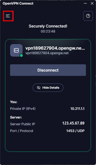 1. VPN을 실행하고 서버에 연결합니다.