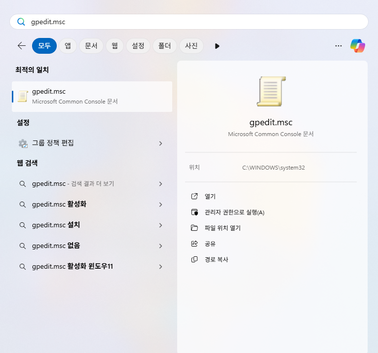 검색 창에서 gpedit.msc 를 입력하여 관리자 권한으로 실행합니다.
