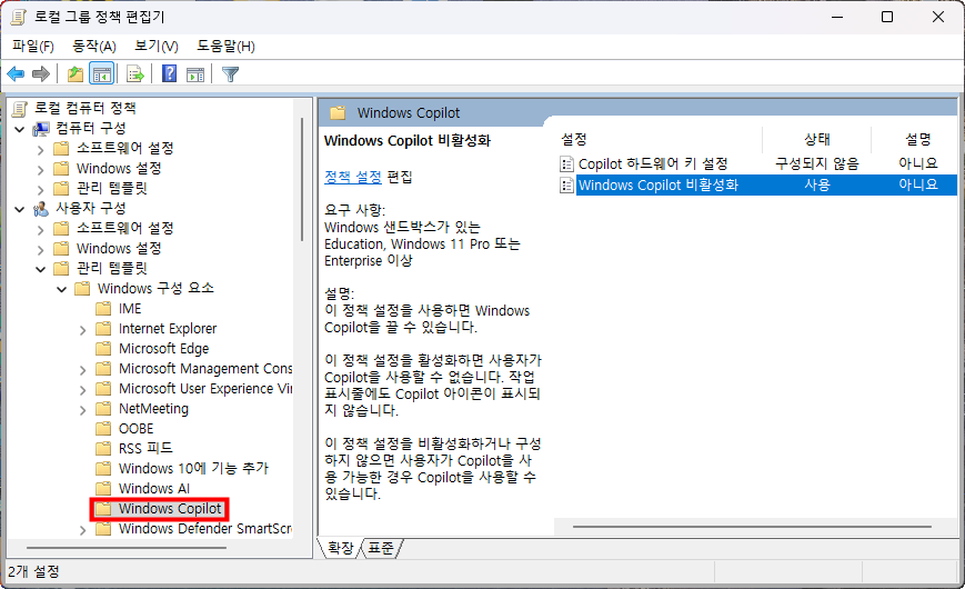 로컬 컴퓨터 정책 - 사용자 구성 - 관리 템플릿 - Windows 구성 요소 - Windows Copilot