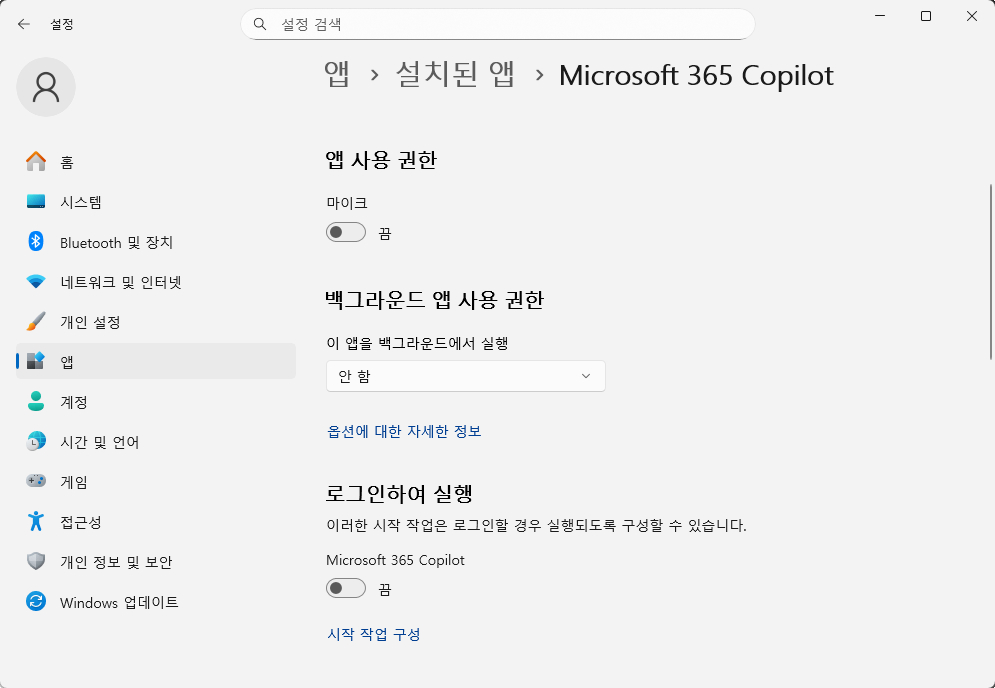 만약 시작 프로그램에서 Copilot 이 켜져 있으면 정책 편집기의 내용은 무시됩니다.