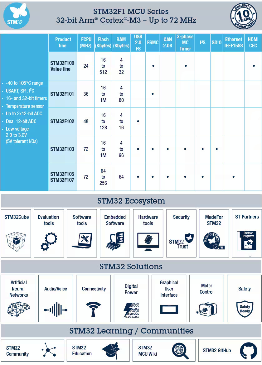 - STM32F103 – 72MHz, 모터 제어, USB 및 CAN을 갖춘 최대 1MB의 플래시