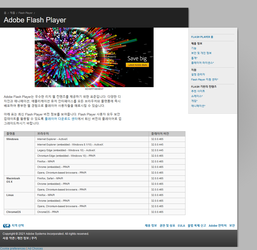 Flash Player 는 32.0.0.465 를 마지막으로 더이상 업데이트 되지 않습니다.